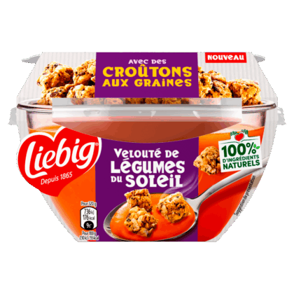 Découvrez ce nouveau produit unique avec un bol de soupe et une coupelle de croûtons aux graines. Faites-vous plaisir avec nos 5 nouvelles recettes de délicieuses soupes Liebig. Velouté ou Mouliné, ces potages sont cuisinés avec amour, 100% d’ingrédients naturels et sans aucun ajout de conservateur*. Nos légumes sont sélectionnés avec soin et cueillis à maturité par nos producteurs. Notre équipe qualité contrôle quotidiennement nos soupes afin de garantir les meilleurs produits. Pratique et savoureuse, cette soupe avec ses croûtons aux graines offre une naturalité et un bon goût, parfaite pour un repas seul. Le bol de soupe se réchauffe directement au micro-onde, en 2min. A consommer chez vous ou à emporter, pour un bon repas rassasiant.